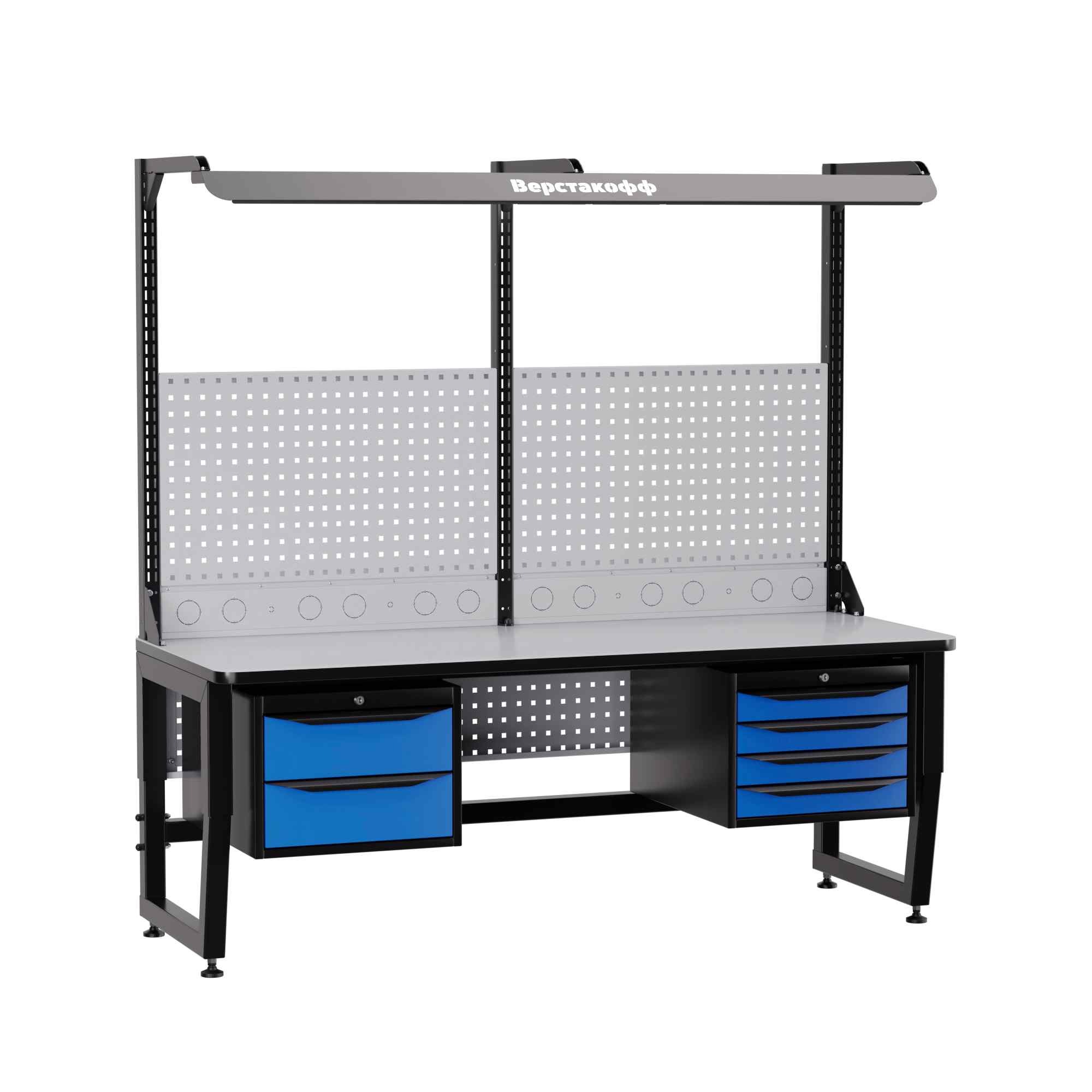 Для наилучшей освещенности при работе с мелкими электронными компонентами рабочее место комплектуется блоком освещения. В его составе - специальный промышленный светильник с необходимой  цветовой температурой и световым потоком, обеспечивающим оптимальные условия работы. Блок освещения располагается над рабочей поверхностью на регулируемых (по высоте и по вылету) кронштейнах<br />